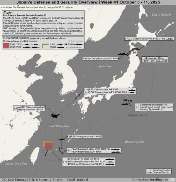 Koji’s War Room Security Report | Week 41 October 5-11, 2025 インテリジェンス 2025.10.12 2025年41週目(10月5~11日) 日本の防衛行動概況および今回から台湾におけるPLA行動概況の資料も併せて掲載します。 当面の間は資料画像のみの掲載となりますので、ご了承ください。 ご意見やご不明な点等ございましたらお気軽にご連絡ください。 以上