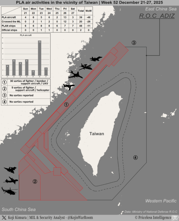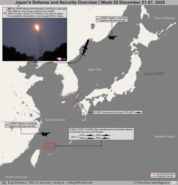 Koji’s War Room Security Report | Week 52 December 21-27, 2025 インテリジェンス 2025.12.28 2025年52週目(12月21日~27日) 日本の防衛行動概況および台湾におけるPLA行動概況の資料も併せて掲載します。 当面の間は資料画像のみの掲載となりますので、ご了承ください。 ご意見やご不明な点等ございましたらお気軽にご連絡ください。 上記資料に関する YouTube 解説動画 以上