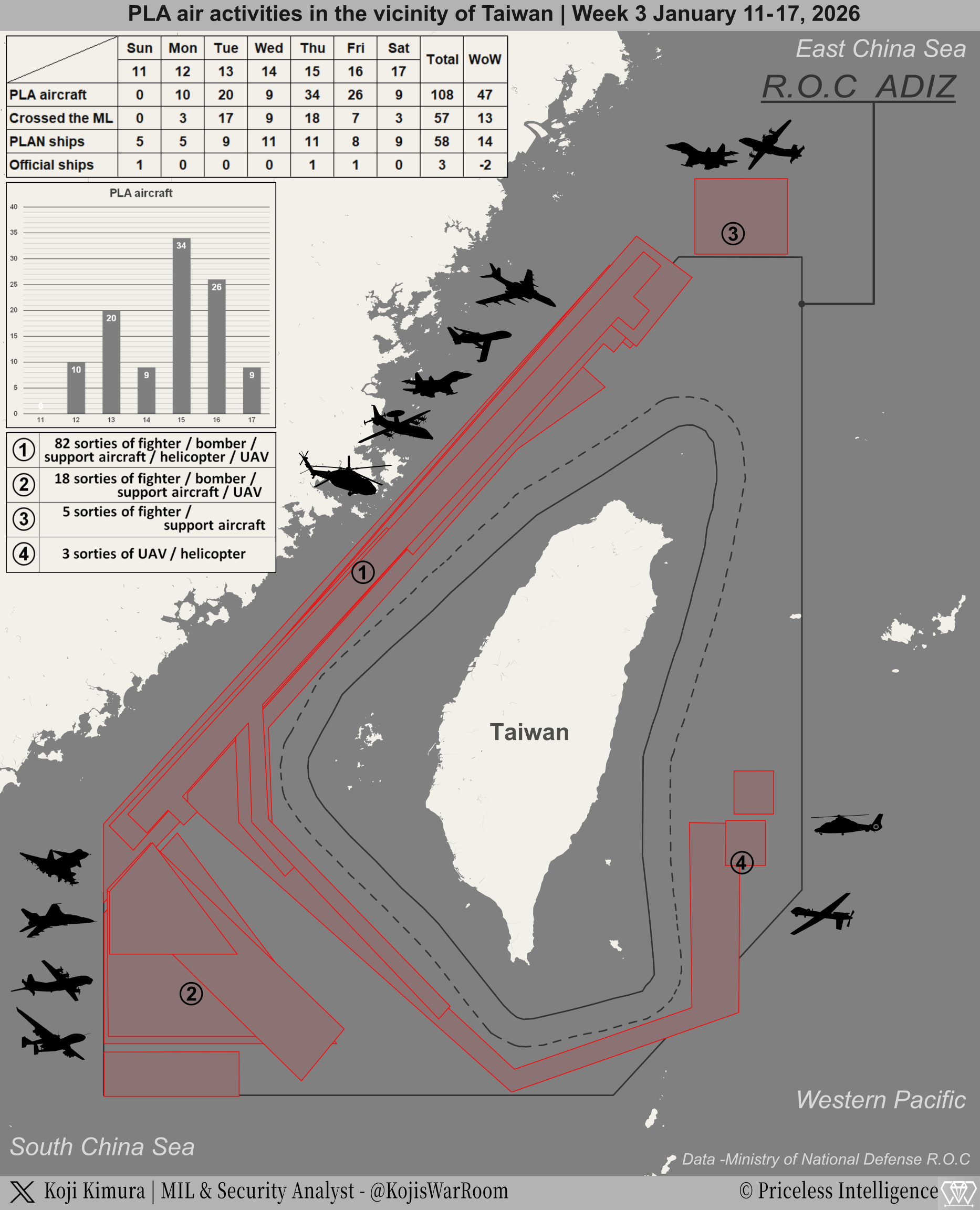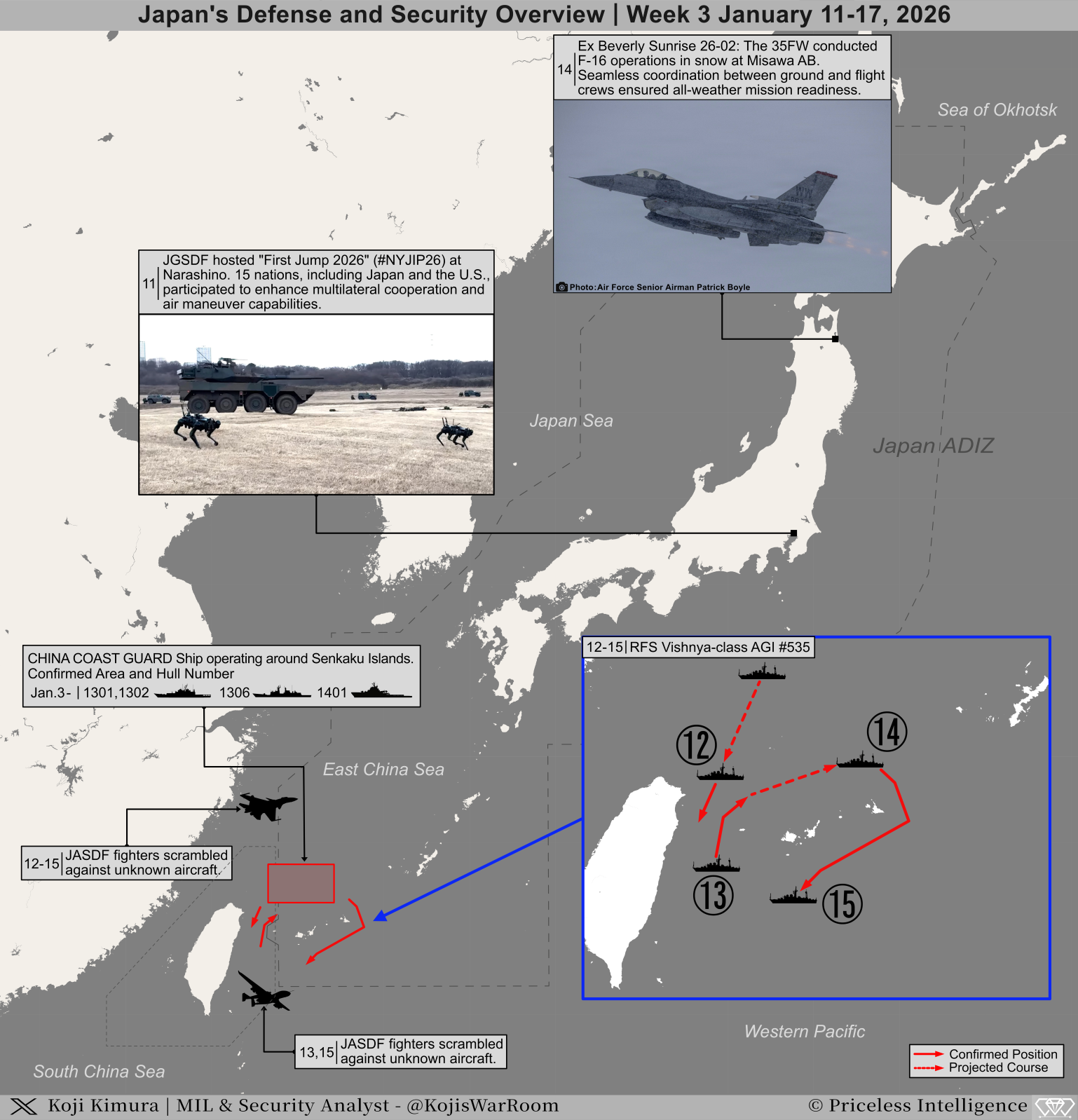 Koji’s War Room Security Report | Week 3 January 11-17, 2026 インテリジェンス 2026.01.18 2026年3週目(1/11-17) 日本の防衛行動概況および台湾におけるPLA行動概況の資料を掲載します。 当面の間は資料画像のみの掲載となりますので、ご了承ください。 ご意見やご不明な点等ございましたらお気軽にご連絡ください。 上記資料に関する YouTube 解説動画 以上