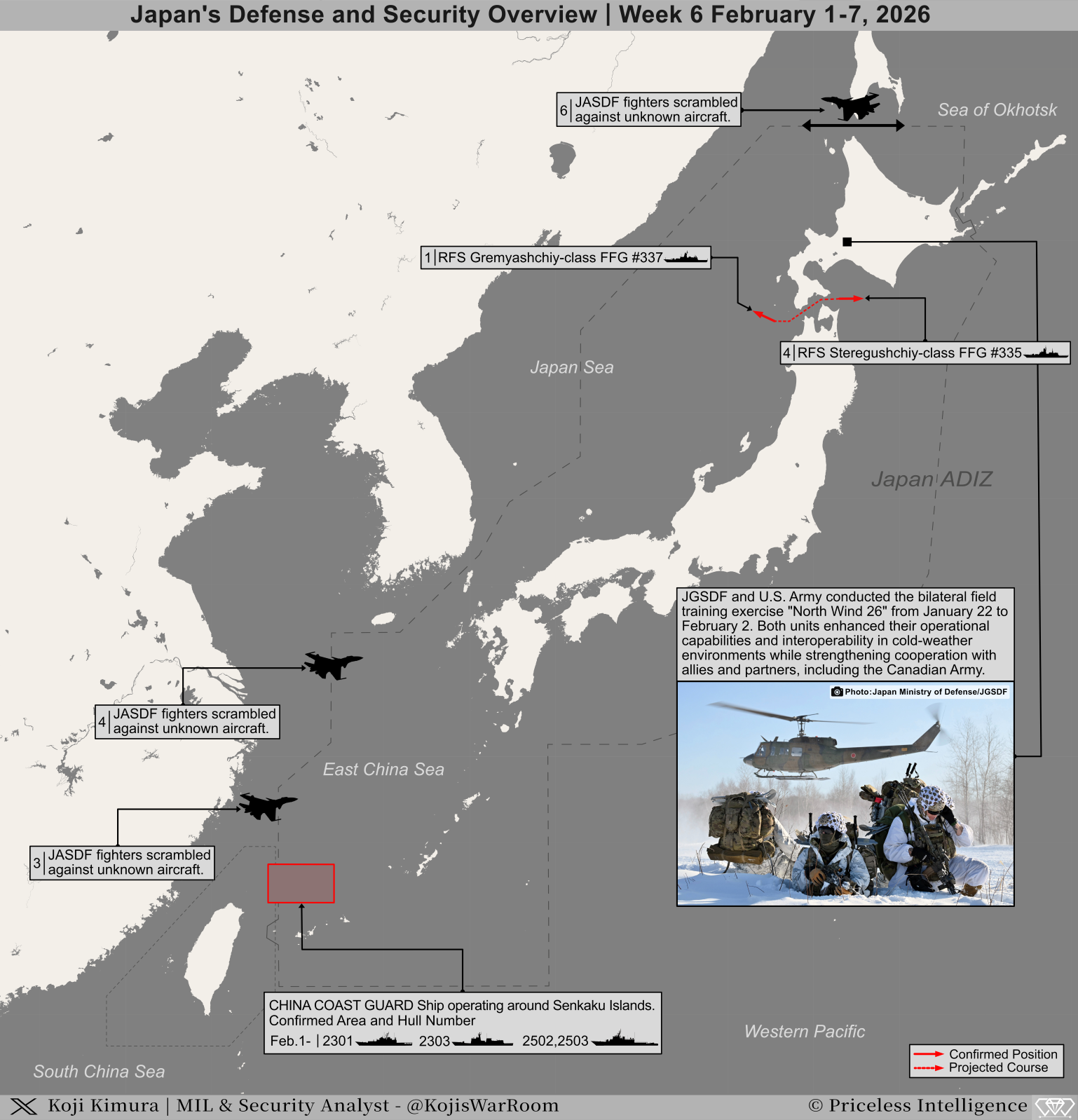 Koji’s War Room Security Report | Week 6 February 1-7, 2026 インテリジェンス 2026.02.08 2026年6週目(2/1-7) 日本の防衛行動概況および台湾におけるPLA行動概況の資料を掲載します。 当面の間は資料画像のみの掲載となりますので、ご了承ください。 ご意見やご不明な点等ございましたらお気軽にご連絡ください。 上記資料に関する YouTube 解説動画 以上 【更新履歴】 2026.02.09 日本海・オホーツク海のスクランブル対応を追加