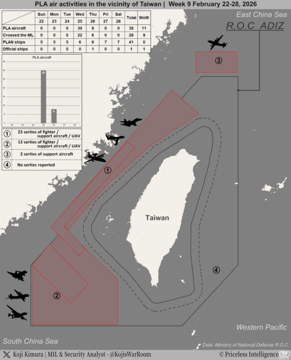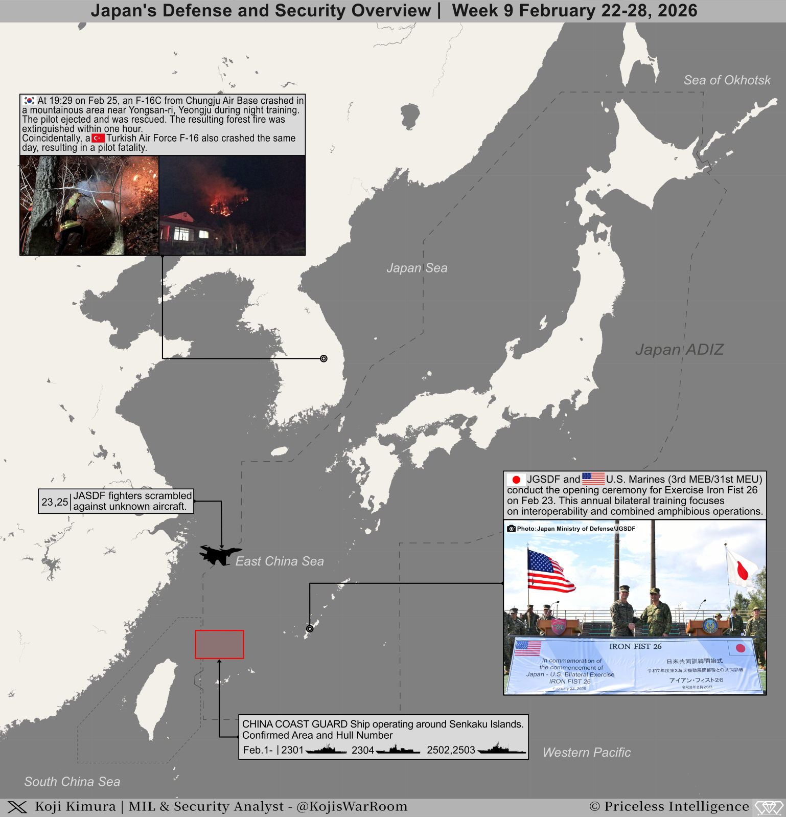 Koji’s War Room Security Report | Week 9 February 22-28, 2026 インテリジェンス 2026.03.01 2026年9週目(2/22-28) 日本の防衛行動概況および台湾におけるPLA行動概況の資料を掲載します。 当面の間は資料画像のみの掲載となりますので、ご了承ください。 ご意見やご不明な点等ございましたらお気軽にご連絡ください。 上記資料に関する YouTube 解説動画 以上 【更新履歴】