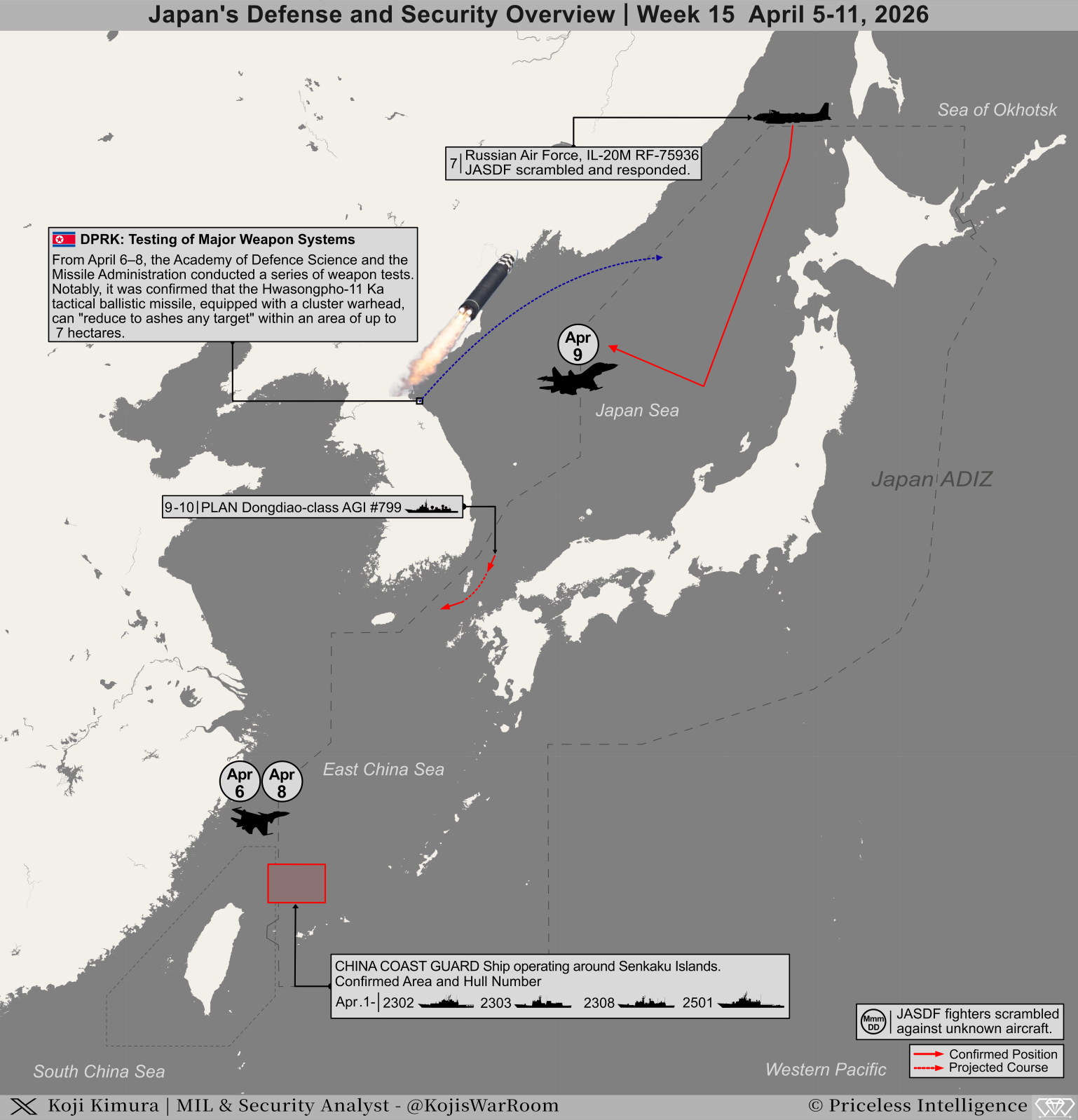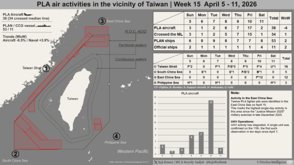 Koji’s War Room Security Report | Week 15 April 5-11, 2026 インテリジェンス 2026.04.12 2026年15週目(4/5-11) 日本の防衛行動概況および台湾におけるPLA行動概況の資料を掲載します。 当面の間は資料画像のみの掲載となりますので、ご了承ください。 ご意見やご不明な点等ございましたらお気軽にご連絡ください。 上記資料に関する YouTube 解説動画 以上 【更新履歴】